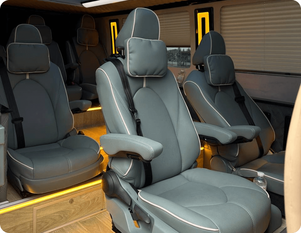 Наші автобуси розраховані на 8 пасажирів та облаштовані всіма потрібними зручностями: зарядні пристрої, пляшки води для кожного пасажира, кондиціонери, телевізор, пледи подушки та інше.